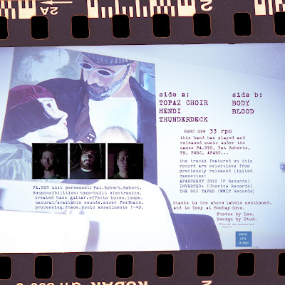 Bombay Cove wants to announce that we are releasing a 7" by PA.RTS, a 3 piece experimental/noise band. Power Electronics, Treated Instruments, Processed Loops and Feedback... the 7" will come out in the spring. Look for them where fine shows happen.